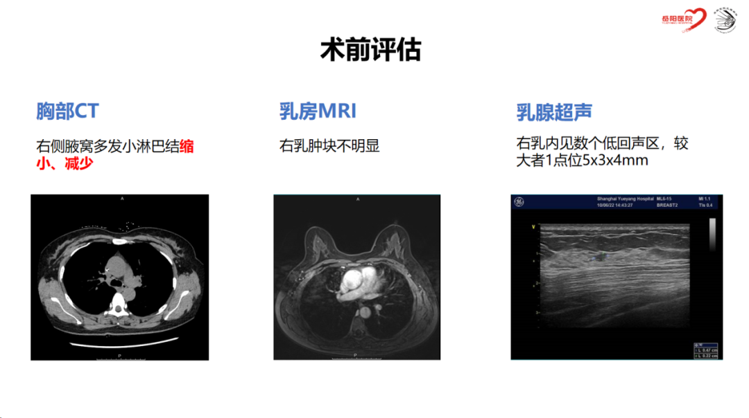 NAC期间每间隔2个化疗周期进行疗效评估,2周期后乳房肿块和腋窝淋巴结明显退缩,4周期后临床触诊阴性,6周期后影像学评估cCR,具体如下: