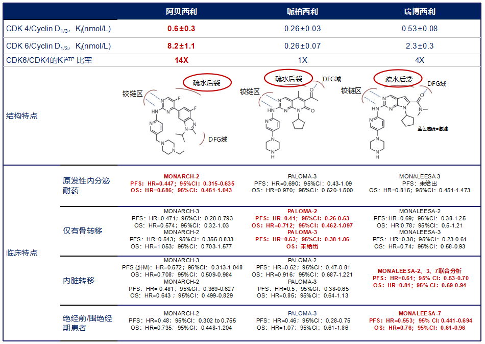 三种CDK4/6抑制剂在结构、药代动力学特征以及研究数据上各有优势(表2)。结构上,阿贝西利比哌柏西利和瑞博西利疏水后袋的取代基(二甲酰胺和乙酰基官能团)更小,阿贝西利可更深地埋在CDK激酶ATP口袋裂缝中。阿贝西利对抑制CDK6/CDK4的KiATP比率是三种CDK4/6抑制剂中最高的,这意味着阿贝西利对CDK4具有更高的选择性,更强抑制乳腺癌细胞增殖,同时对CDK6抑制作用相对降低,降低骨髓毒性发生。
