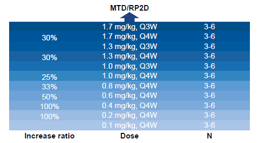 研究观察到2例DLTs,包括一例受试者在3.0 mg/kg(Q3W)剂量下出现的2级肌酐清除率下降和一例受试者在3.5 mg/kg(Q3W)剂量下的3级血小板减少伴出血。研究没有达到方案规定的最大耐受剂量。