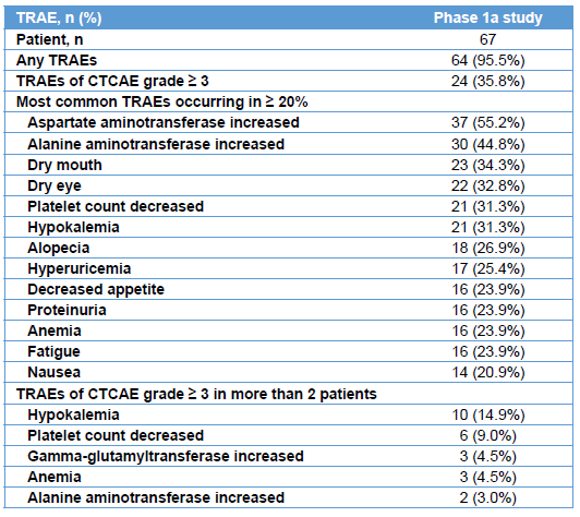 24例(35.8%)患者出现3级以上治疗相关的不良事件(TRAEs),最常见的不良事件包括低钾血症(n=10,14.9%)和血小板计数下降(n=6,9.0%)。