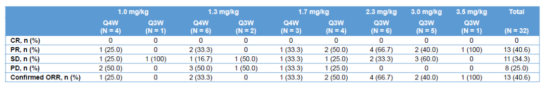 研究在1.0 mg/kg及以上剂量组观察到客观缓解,在1.0 mg/kg及以上剂量组的32例患者中,ORR为40.6%(13/32)。在HER2阳性的乳腺癌中,在RP2D 2.3 mg/kg Q3W下,ORR为66.7%(4/6)。
