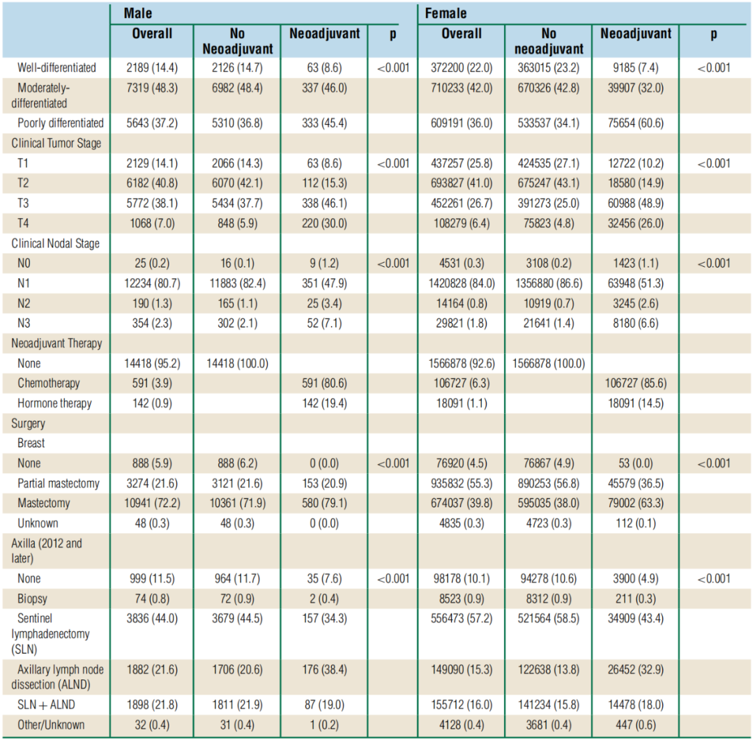 研究人员对2004年至2017年美国国家癌症数据库(NCDB)的数据进行了回顾性分析。研究人员首先确定了所有诊断为非转移性侵袭性乳腺癌患者(AJCC临床期Ⅰ-Ⅲ期),并根据性别、临床肿瘤分期(非局部晚期cT1/2;局部晚期cT3/4),以及患者是否接受了NT进行了分层。