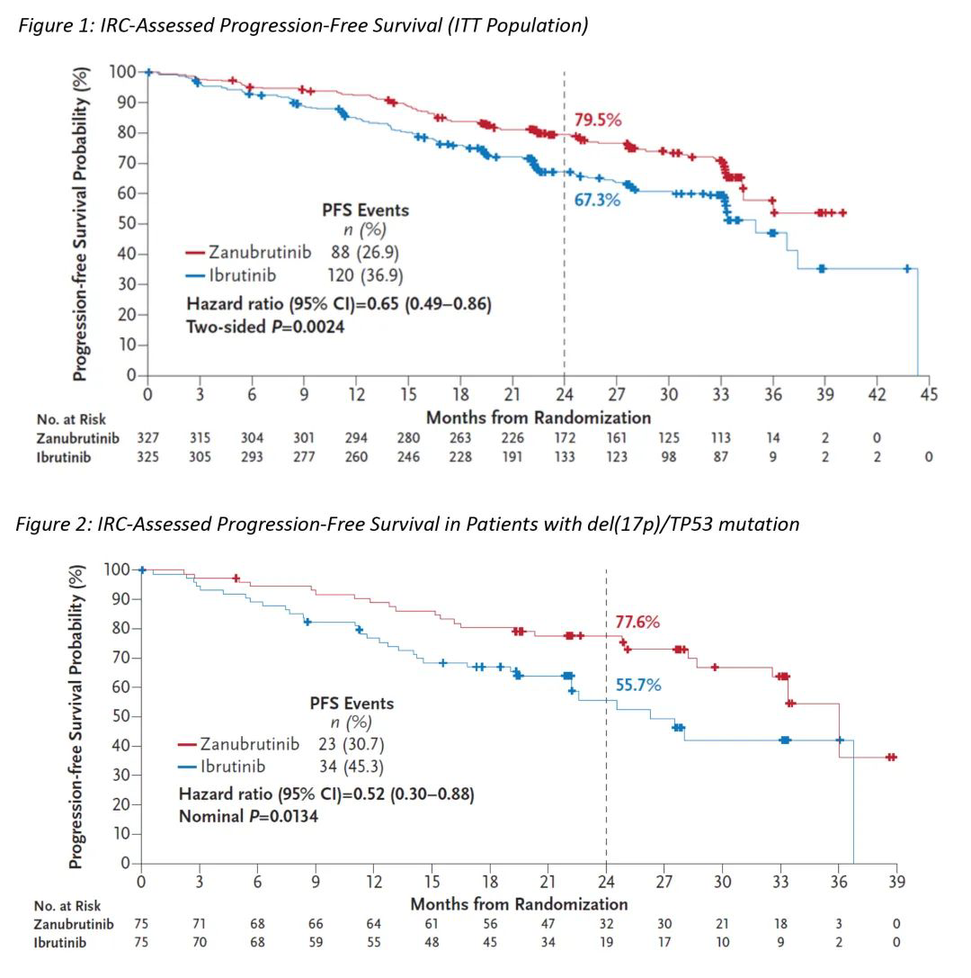来自15个国家的患者(N=652)随机接受泽布替尼(N=327)或伊布替尼(N=325)治疗。泽布替尼和伊布替尼组之间的人口统计学和疾病特征均衡(年龄≥65岁[61.5 vs 61.5%];男性[65.1 vs 71.4%];IGHV未突变[73.1 vs 73.5%];del(17p)[13.8 vs 15.4%];TP53突变无del(17p)[9.2 vs 7.7%])。在研究人群中,中位年龄分别为67岁和68岁;两组的中位既往治疗线数均为1。