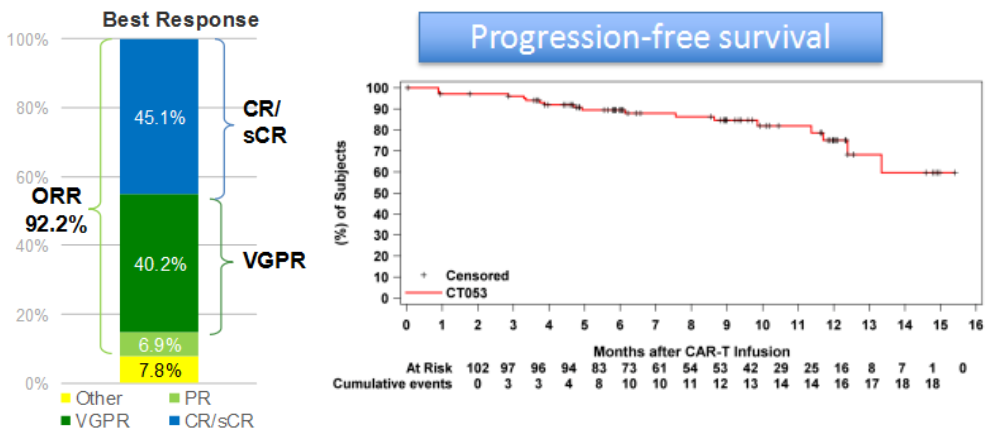 截至2022年8月16日,其结果显示:①由IRC评估的客观缓解率(ORR)高达92.2%,其中≧VGPR为85.3%(87/102),完全缓解率(CR)则为45.1%(46/102)。达CR的患者微小残留病(MRD)阴性为100%,达VGPR的患者MRD阴性率为96.3%;②中位随访9个月后,部分缓解(PR)以上疗效的患者,86.2%仍维持缓解;中位缓解持续时间(mDOR)尚未达到,而6个月及9个月DoR分别为92.6%和86.1%;此外6个月及9个月的无进展生存率(PFS)分别为89.4%及84.6%,中位PFS仍未达到。