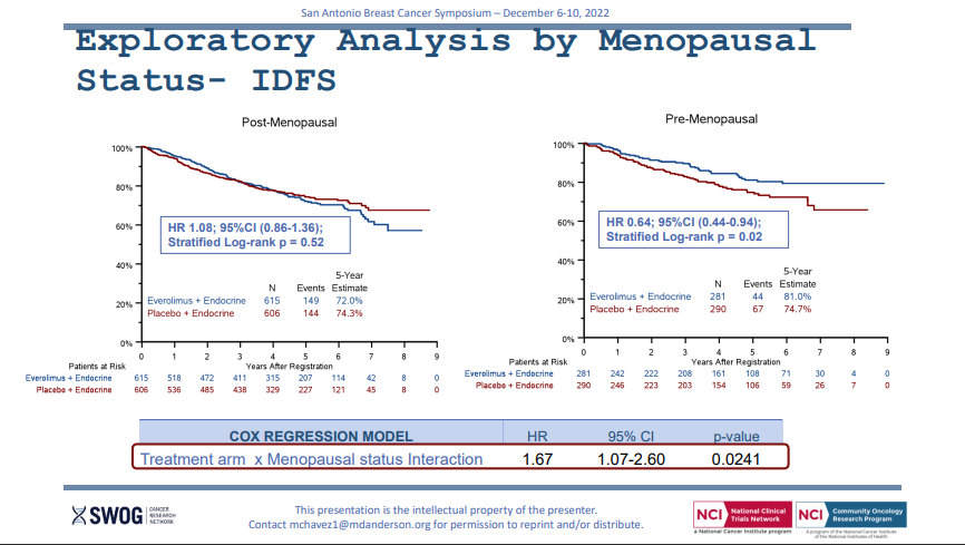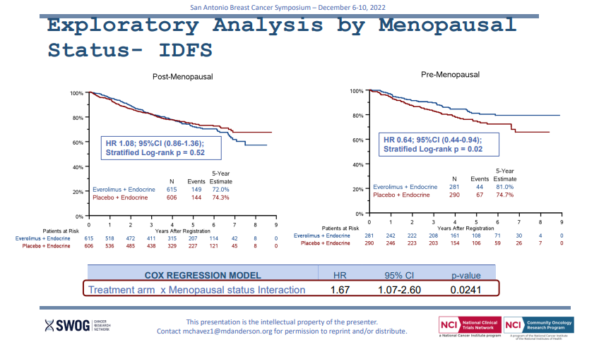 结论:在标准辅助内分泌治疗基础上增加一年的依维莫司并没有改善IDFS或OS,并且依维莫司与较低的治疗完成率和增加的不良事件相关。在绝经前患者中,IDFS和OS具有与假设一致的获益情况。未来的转化研究将评估依维莫司获益和药物毒性潜在的预测因子。