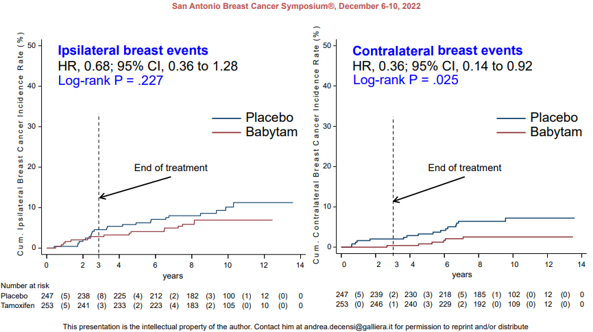 前期一项Ⅲ期试验表明,在中位随访5.1年的非浸润性乳腺癌切除的人群中(包括非典型导管增生、DCIS或LCIS),持续3年每天服用5 mg他莫昔芬,可以将浸润性乳腺癌或DCIS的复发率降低52%。他莫昔芬组每天仅多出一次潮热,与安慰剂组相比,毒性可以忽略不计。这些发现因可降低乳腺癌风险而被纳入ASCO临床实践指南,作为非侵袭性乳腺癌患者的标准治疗和持续使用他莫昔芬或芳香酶抑制剂治疗的替代方案。