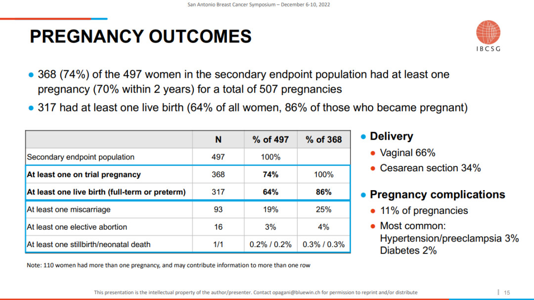 研究的次要终点包含怀孕结局,因而分析了18个月中断内分泌治疗后的怀孕情况。研究发现怀孕组和未怀孕组的P值无统计学差异。研究发现高达74%的患者至少有一次以上的怀孕,同时其中64%的患者成功生育。所以该类型人群的怀孕结果不错,并且可能在辅助生殖帮助下,诞生了15对双胞胎。48个月时,76%的患者已经重新开始内分泌治疗,15%还未重新开始,而8%的患者在此之前有肿瘤复发或者死亡。
