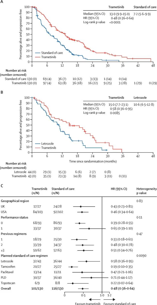 在这项特殊的随机2/3期试验中,曲美替尼与多种可用的二线治疗进行了比较。本试验中的所有患者既往均接受了铂类药物治疗。本研究明确表明,与标准的单药细胞毒性药物以及内分泌治疗药物相比,曲美替尼改善了无进展生存期,具有统计学显著性。