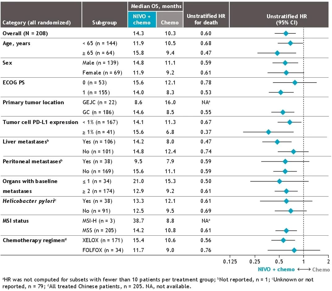 中国患者中,NIVO+化疗组与化疗组相比,在OS方面继续表现出有临床意义的改善。在PD-L1 CPS≥5的患者中,与化疗组相比,NIVO+化疗组的死亡风险降低44%(中位OS:15.5个月vs.9.6个月;HR=0.56);所有随机患者中,NIVO+化疗组的死亡风险降低38%(中位OS:14.3个月vs.10.3个月;HR=0.62),见图2。