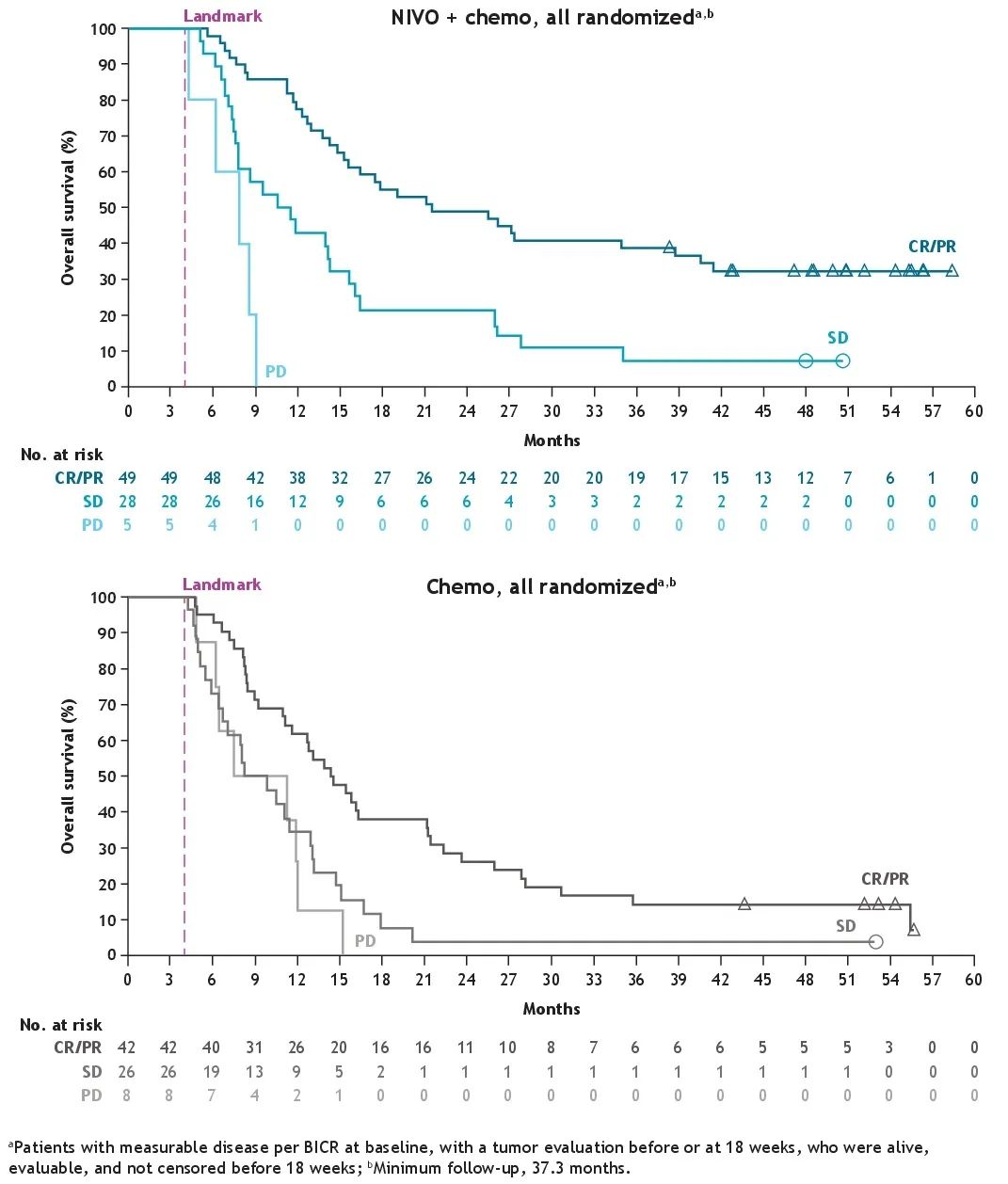 在PD-L1 CPS≥5且基线有可测量病变的患者中,NIVO+化疗vs.化疗的客观缓解率(ORR)为68%vs.48%;在所有随机入组患者中,ORR分别为66%和45%(表1,表2)。