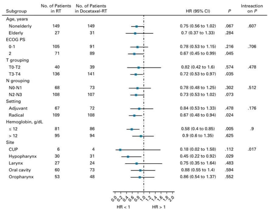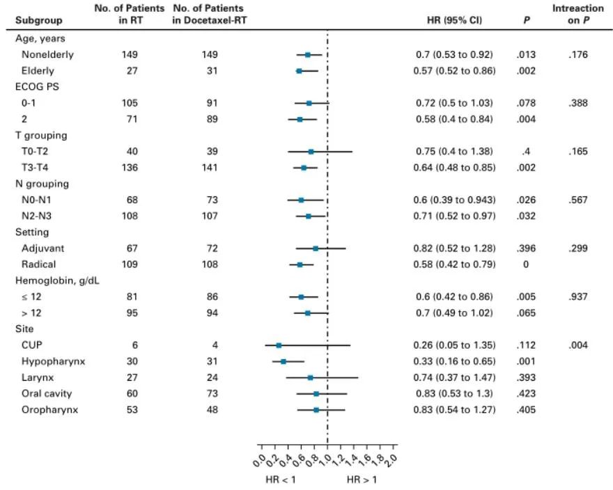 放射治疗中加入多西他赛后,死亡HR为0.747(95%CI:0.569~0.980;P=0.035),当研究人员调整影响OS的已知预后因素时,这一改善仍然保持(HR 0.694;95%CI:0.527~0.915;P<0.001)。此外,多西他赛在所有预定的预后组中都观察到这种OS改善(图4)。