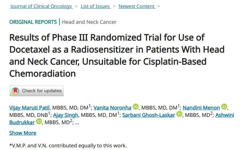 1.Patil VM,Noronha V,Menon N,et al.Results of phase III randomized trial for use of docetaxel as a radiosensitizer in patients with head and neck cancer,unsuitable for cisplatin-based chemoradiation.J Clin Oncol.Published online January 27,2023.doi:10.1200/JCO.22.00980