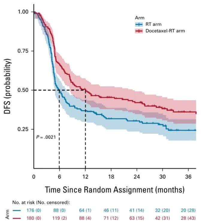 在该项研究中,中位随访32.4个月(四分位数范围:26.3~42.1),放疗联合多西他赛治疗的2年DFS率为42%(95%CI:34.6%~49.2%)(图1),而单独放疗的2年DFS率为30.3%(95%CI:23.6%~37.4%)(HR 0.673;95%CI:0.521~0.868;log-rank P=0.002)。