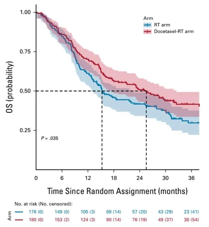 共发生210例死亡,多西他赛-RT组97例,RT组113例。多西他赛-RT组的中位OS为25.5个月(95%CI:17.6~32.5),而RT组为15.3个月(95%CI:13.1~22.0)(log-rank P=0.035)。Docetaxel-RT组和RT组的2年OS率分别为50.8%(95%CI:43.1%~58.1%)和41.7%(95%CI:34.1%~49.1%)(图3)。
