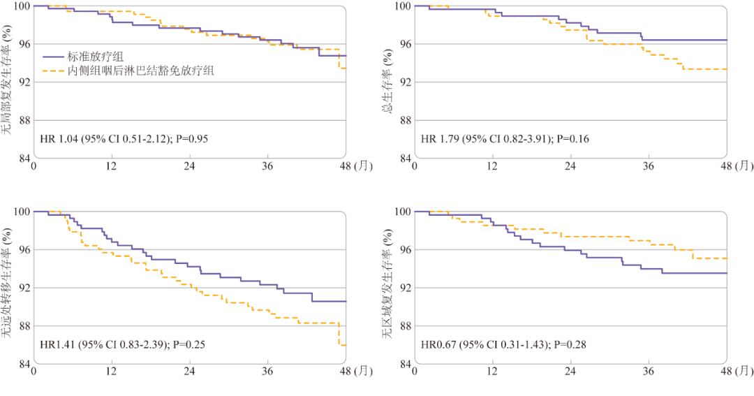 在毒副反应和生活质量方面,内侧组咽后淋巴结区豁免放疗组放疗相关毒副反应发生率更低,包括急性黏膜炎(内侧组咽后淋巴结豁免放疗组67.7%对标准放疗组79.8%)、急性吞咽困难(25.5%对35.1%)、体重下降(46.8%对57.8%)以及晚期吞咽困难(24.0%对34.3%)。另外,内侧组咽后淋巴结区豁免放疗组在健康状况、社会功能、是否容易疲劳及吞咽困难等方面的生活质量均明显优于标准放疗组。