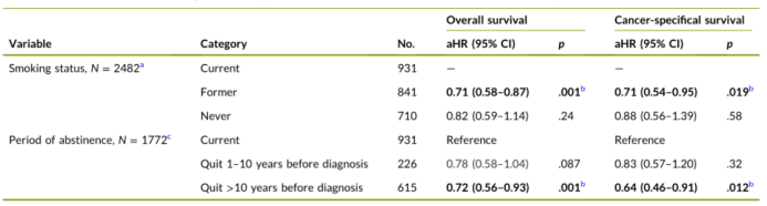 编者按:近日,根据Cancer上发表的一项研究结果,戒烟时间>10年与头颈部鳞状细胞癌(HNSCC)患者的总体死亡率及HNSCC特异性死亡率降低显著相关。