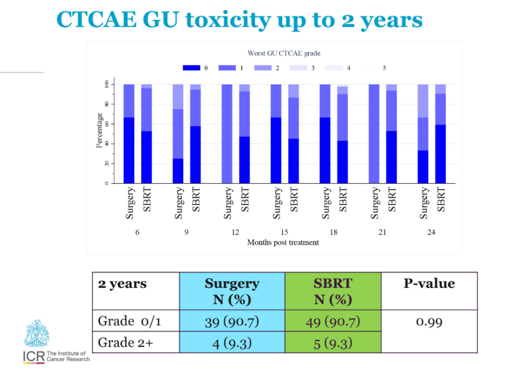 在2年时,两组观察到的≥2级泌尿生殖不良事件(常见不良反应事件评价标准,CTCAE GU)没有显著差异(9.3%vs 9.5%,P=0.97),两组均没有发生≥2级的胃肠道不良事件。