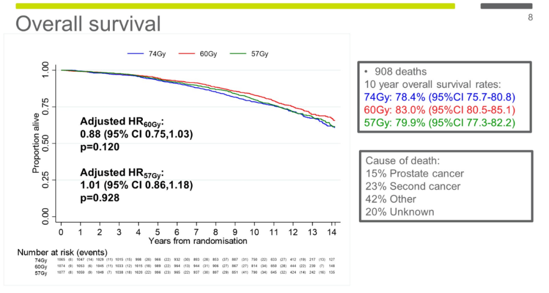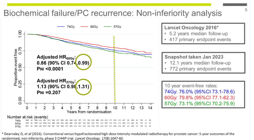 中位随访时间为12.1年,74Gy组、60Gy组、57Gy组患者的10年无BCF生存率分别为76.0%(95%CI:73.1%~78.6%)、79.8%(77.1%~82.3%)、73.4%(70.5%~76.1%)。与初次分析一样,60Gy组非劣效于74Gy组(HR 0.84,90%CI:0.72~0.97),而57Gy组没有达到非劣效性(HR 1.13,90%CI:0.98~1.30)。