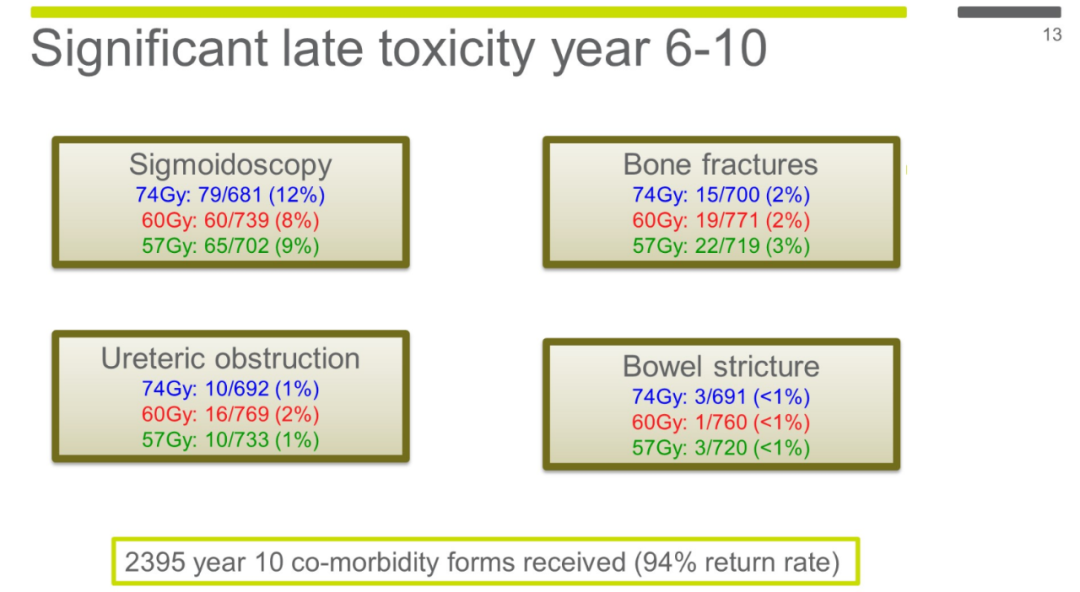 在10年随访中,74Gy组、60Gy组和57Gy组分别有2%(15/700)、2%(19/771)和3%(22/719)的患者报告骨折事件。报道的最常见不良事件干预手段是乙状结肠镜检查,三组患者的发生率分别为12%(79/681)、8%(60/739)和9%(65/702);其中分别有81%(63/78)、81%(48/59)和85%(55/65)的患者是由于胃肠道症状而采取乙状结肠镜检的。其他预设的共病或相关干预手段(输尿管梗阻、肠狭窄、经尿道前列腺切除术、尿道切开术、尿道扩张或长期导尿,或使用类固醇、硫糖铝、福尔马林、激光凝固或直肠分流治疗直肠疾病),在各组患者中的发生率大多<1%。
