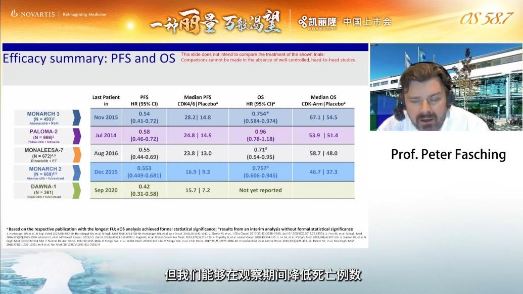 在吴炅教授的主持下,王树森教授首先带来了“晚期乳腺癌内分泌治疗百年变革”的讲课,历数了晚期乳腺癌患者内分泌治疗的历程。在讲课中他提到,患者在内分泌治疗过程中,新的问题也随之出现,即内分泌单药方案治疗后出现耐药,耐药机制可能包括ER表达改变、生长因子受体过表达或激活、下游信号转导通路激活等。CDK4/6抑制剂的横空出世,使HR+/HER2-晚期乳腺癌患者总生存期日益延长。MONALEESA-7是全球第一个聚焦于CDK4/6抑制剂治疗绝经前/围绝经期HR+/HER2-晚期乳腺癌患者的Ⅲ期试验,并且获得了阳性结果,研究结果显示,瑞波西利+内分泌治疗可相较于单独内分泌治疗改善患者PFS和OS。