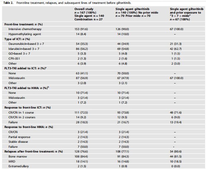 纳入2019年3月1日~2021年3月1日期间37个法国医疗中心接受gilteritinib治疗的167例(队列A)FLT3-ITD和/或TKD突变的AML患者,其中140例(队列B)接受gilteritinib单药治疗,67例(队列C)接受过强化疗+米哚妥林治疗,另外27例接受含gilteritinib在内的联合治疗。