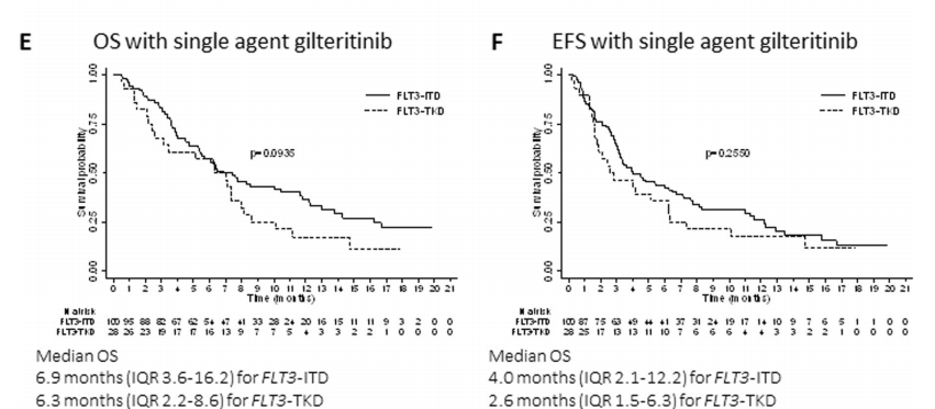 3.对队列C患者进行亚组分析发现,较之于仅接受过3+7方案一线治疗的患者而言,接受“3+7+米哚妥林”一线治疗的患者,后续接受gilteritinib治疗带来OS相对更好,分别为6.4个月vs7.8个月;而FLT3-ITD突变的R/R-AML患者的生存结局亦有一定优势,OS分别为6.9个月(FLT3-ITD)vs6.3个月(FLT3-TKD);EFS则分别为4.0个月(FLT3-ITD)vs2.6个月(FLT3-TKD)。