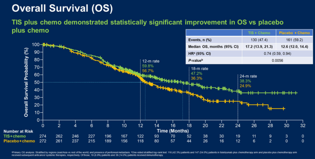 该试验中期分析结果显示,在总体人群中,与单独化疗(n=272)相比,替雷利珠单抗联合化疗(n=274)显著改善患者的中位总生存(OS),二组的中位OS为17.2个月(95%CI:13.9~21.3)vs.12.6个月(95%CI:12.0~14.4)(HR,0.74;95%CI:0.59~0.94;P=0.0056),这意味着该获益转化为替雷利珠单抗联合化疗组的死亡风险相对降低24%。