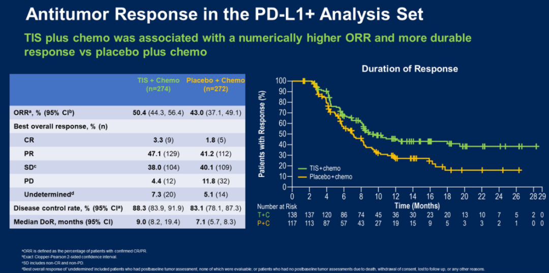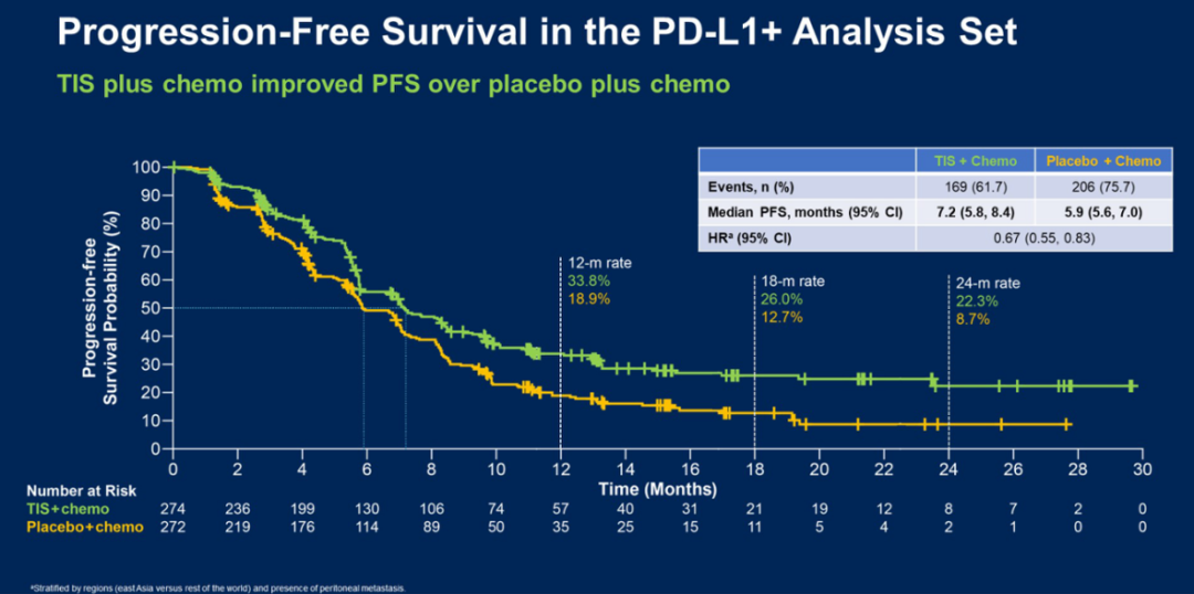 在PD-L1阳性肿瘤患者亚组,接受替雷利珠单抗联合化疗组、单独化疗组的中位PFS为7.2(95%CI:5.8~8.4)vs.5.9个月(95%CI:5.6~7.0),HR=0.67(95%CI:0.55~0.83)。