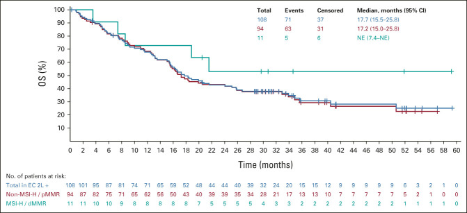 无论组织学亚型或MMR状态如何,患者均有肿瘤缓解。在更新的数据中,患者被分入非微卫星高度不稳定(non-MSI-H)/错配修复正常(pMMR;n=94)亚组以及MSI-H/错配修复缺陷(dMMR;N=11)亚组。两组患者的中位PFS分别为7.4个月(95%CI:4.4~7.6)和26.4个月(95%CI:4.0~NE),ORR分别为38.3%(36例)和63.6%(7例)。non-MSI-H/pMMR患者的中位OS为17.2个月(95%CI:15.0~25.8),MSI-H/dMMR患者的中位OS为NE(95%CI:7.4~NE)。此外,non-MSI-H/pMMR肿瘤患者的中位DOR为23.0个月(95%CI:8.5-NE),而MSI-H/dMMR肿瘤患者的中位DOR为21.2个月(95%CI:7.3-NE)。研究者指出,在4年时,两个亚组的DOR仍处于较高范围。