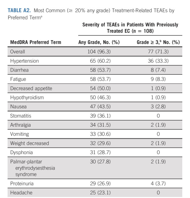 高血压、脂肪酶升高、疲劳和腹泻是最常见的≥3级TEAE。最常见的任何级别AE包括高血压(60.2%)、腹泻(53.7%)、疲劳(53.7%)、食欲下降(50.0%)、甲状腺功能减退(46.3%)和恶心(43.5%)。