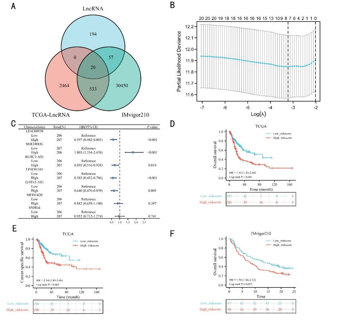 这项研究的结果显示:MRLS最终由七个在BC患者中具有预后价值的lncRNA(GATA3-AS1、LINC00930、LINC01341、MED14OS、MIR100HG、RUSC1-AS1和SNHG4)组成。并通过内部和外部验证,确定了MRLS的在BC患者中的预后价值(图2)。