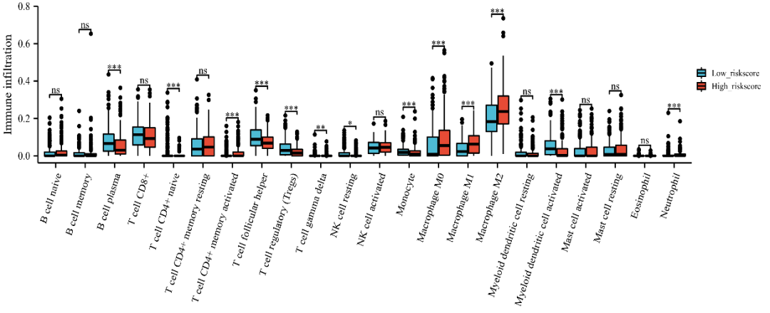 同时,高MRLS组与CD274、CD40、CTLA4、PDCD1、PDCD1LG2等多项免疫检查点呈正相关。在免疫细胞浸润中,高危评分样本与CD4+T 272记忆激活细胞、Tγδ细胞、巨噬细胞M0细胞、巨噬细胞M1细胞、巨噬细胞M2细胞和中性粒细胞浸润呈正相关(图4)。