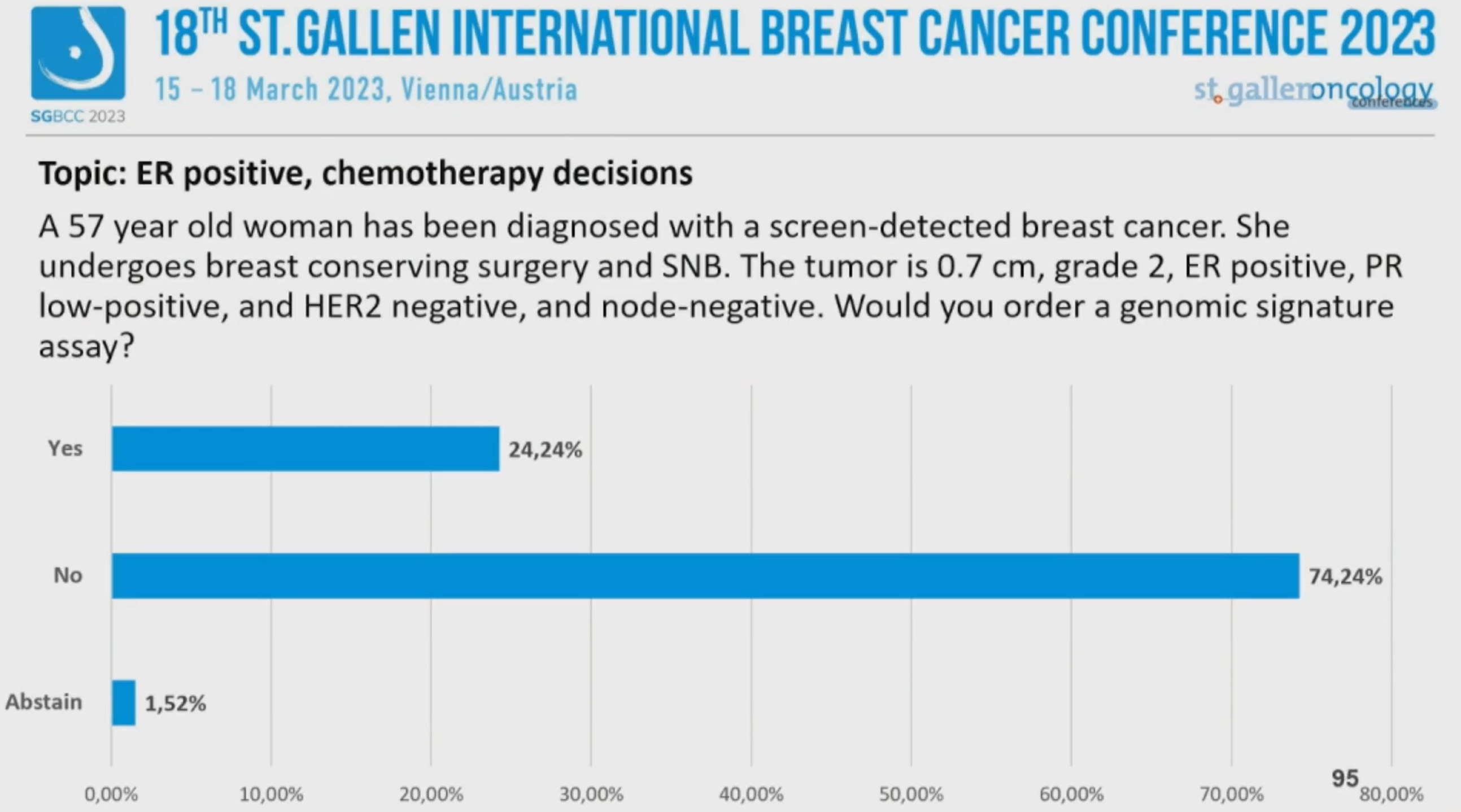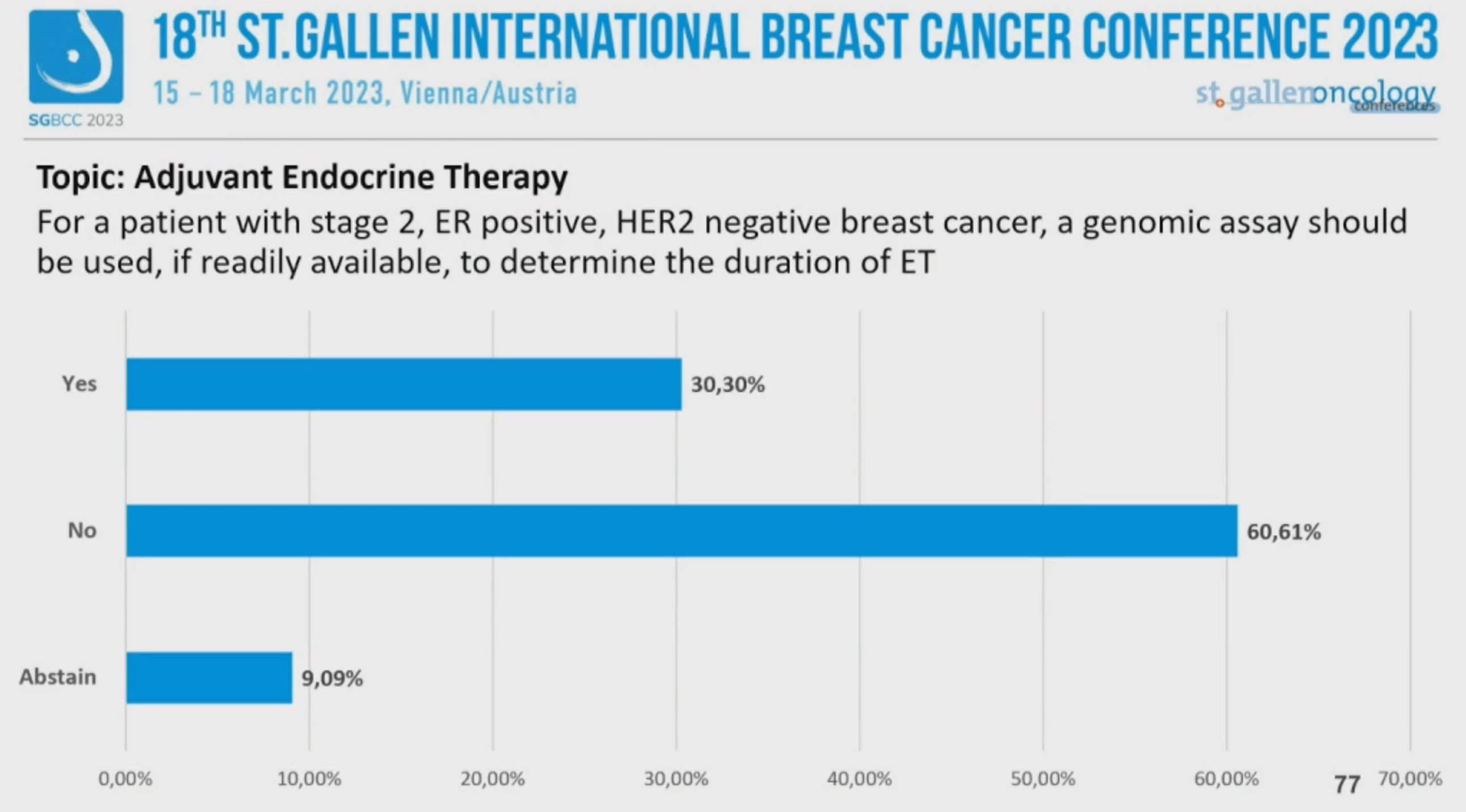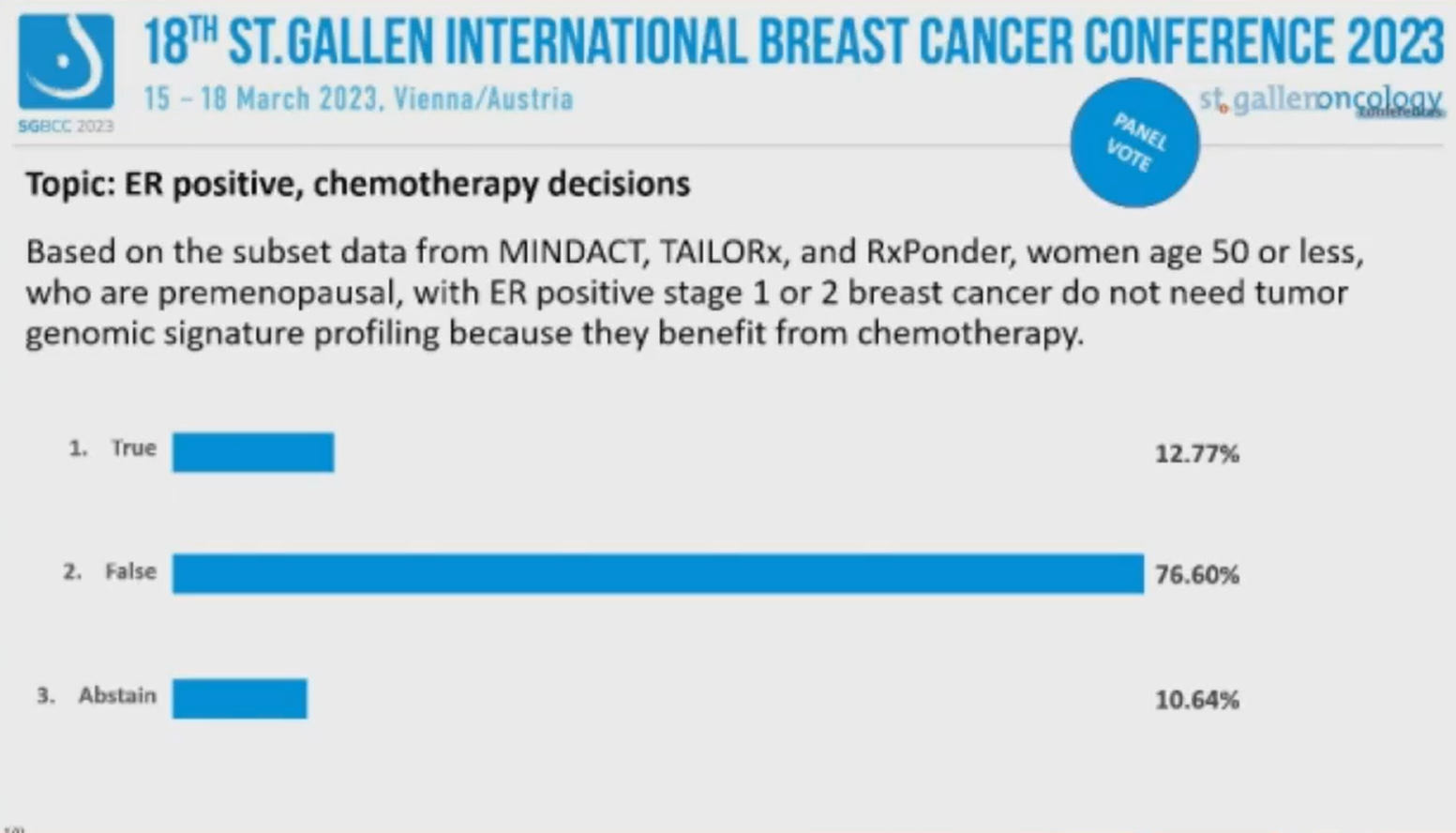 第18届St.Gallen国际乳腺癌大会(SGBCC 2023)于当地时间2023年3月15~18日在“世界音乐之都”维也纳举行。SGBCC汇聚全球各地的乳腺癌意见领袖,围绕最前沿、最具争议的早期乳腺癌诊治话题展开讨论和投票,形成每两年一更新的St.Gallen早期乳腺癌国际专家共识。大会的最后一天,专家投票压轴登场。《肿瘤瞭望》整理了雌激素受体(ER)阳性乳腺癌辅助内分泌治疗和化疗决策这两个专题的专家投票。