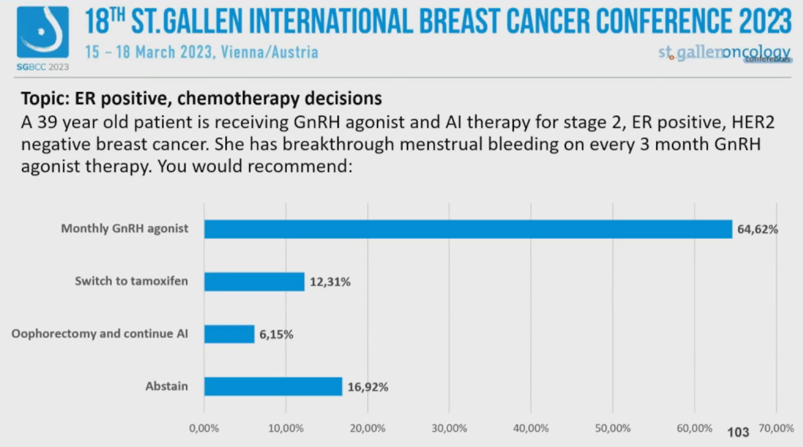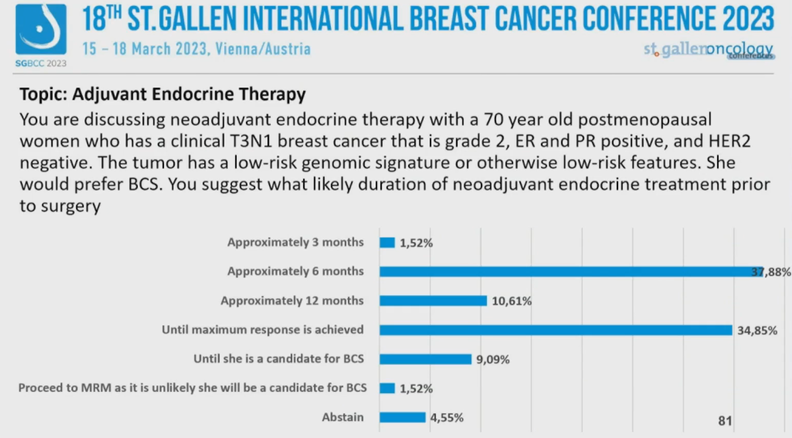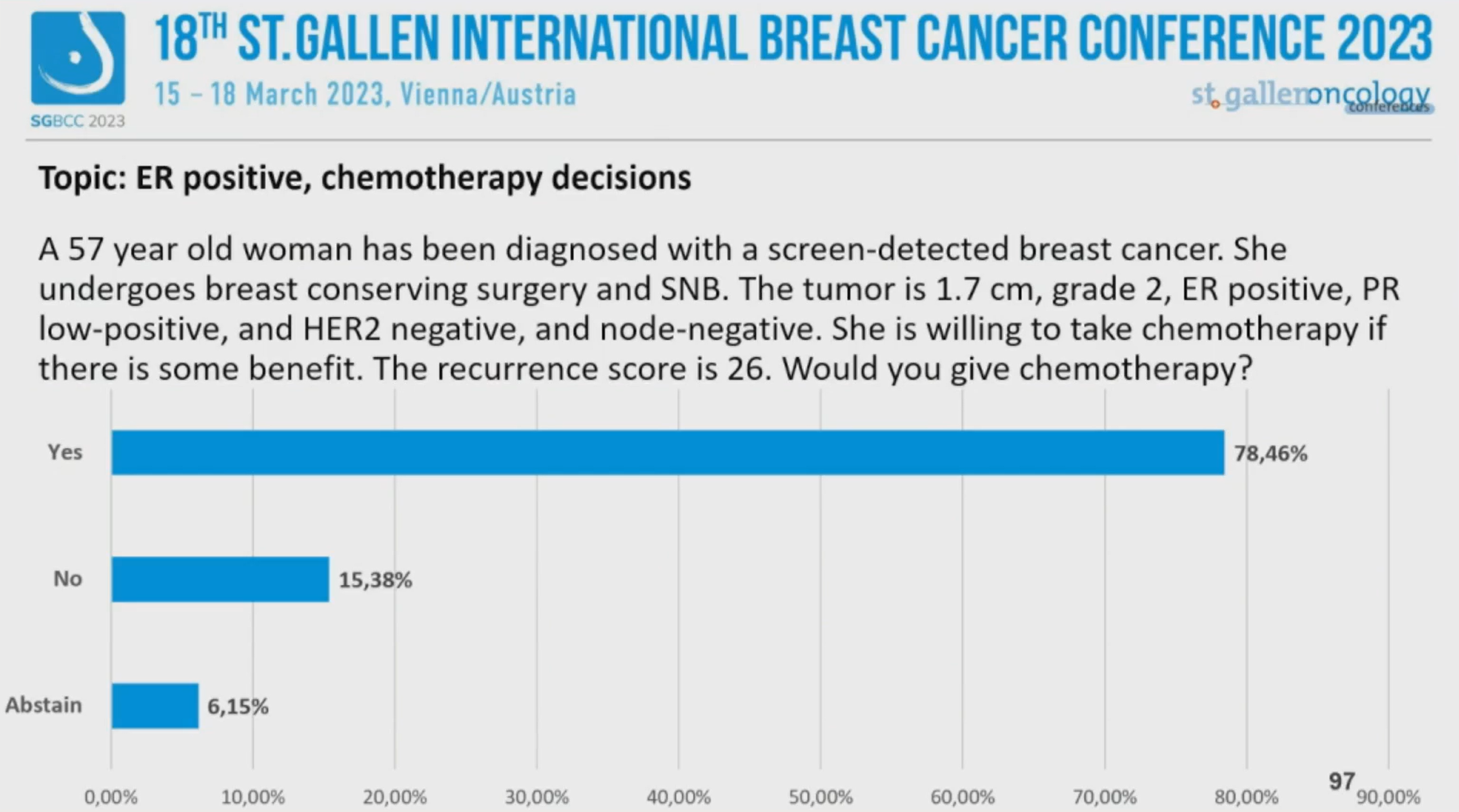 第18届St.Gallen国际乳腺癌大会(SGBCC 2023)于当地时间2023年3月15~18日在“世界音乐之都”维也纳举行。SGBCC汇聚全球各地的乳腺癌意见领袖,围绕最前沿、最具争议的早期乳腺癌诊治话题展开讨论和投票,形成每两年一更新的St.Gallen早期乳腺癌国际专家共识。大会的最后一天,专家投票压轴登场。《肿瘤瞭望》整理了雌激素受体(ER)阳性乳腺癌辅助内分泌治疗和化疗决策这两个专题的专家投票。