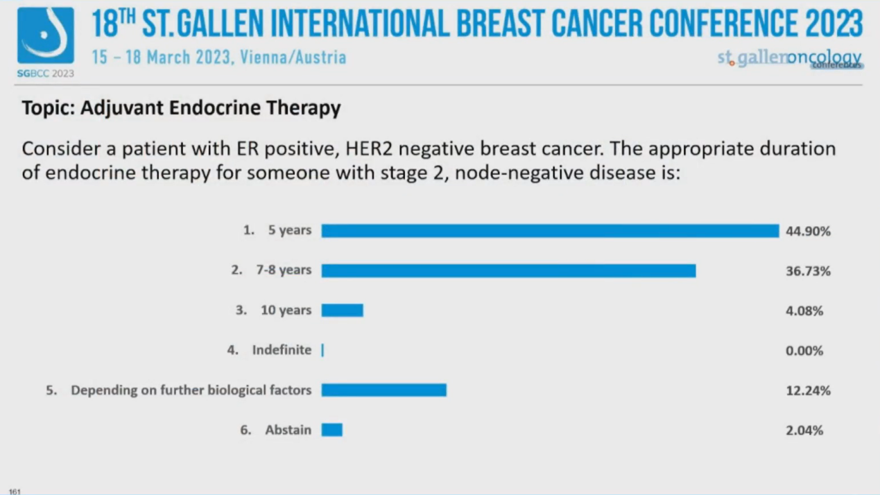 (3)对于淋巴结阴性、肿瘤分期为2期的ER+、HER2-乳腺癌患者,你认为内分泌治疗的疗程应该为: