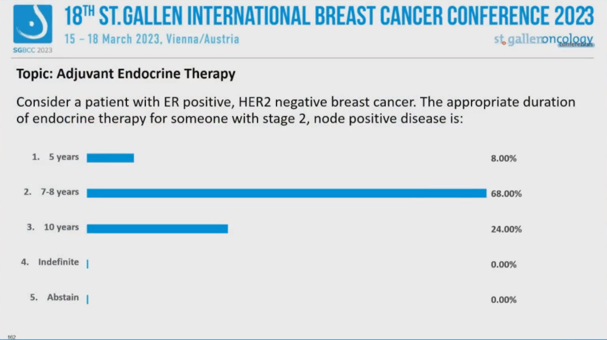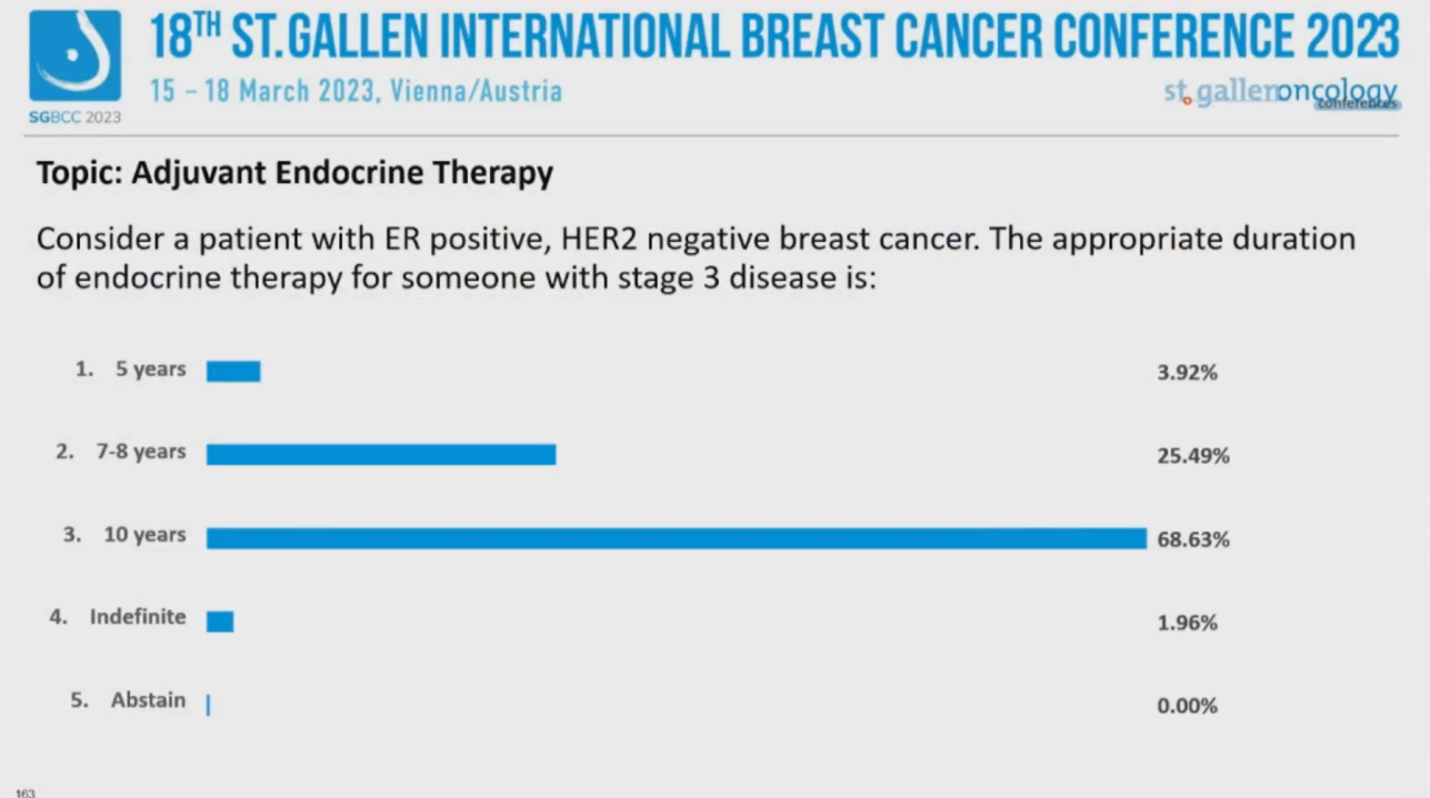 (5)对于肿瘤分期为3期的ER+、HER2-乳腺癌患者,你认为内分泌治疗的疗程应该为: