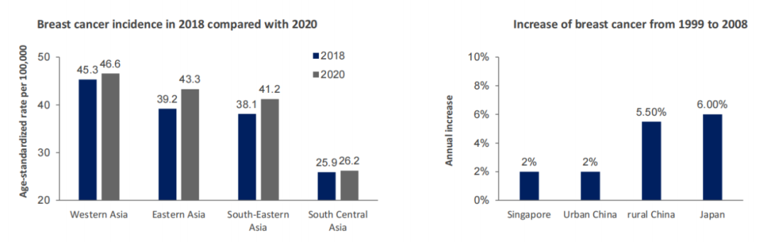 与此同时,亚洲乳腺癌患者的发病年龄与西方国家相比也较早。相关数据显示,西方国家约20%的乳腺癌患者诊断年龄<50岁,而亚洲国家诊断年龄<50岁的乳腺癌患者超过40%。东亚地区(中国,中国香港、中国台湾、日本和韩国)的乳腺癌发病峰值在45~49岁,美国乳腺癌发病峰值约为70岁。
