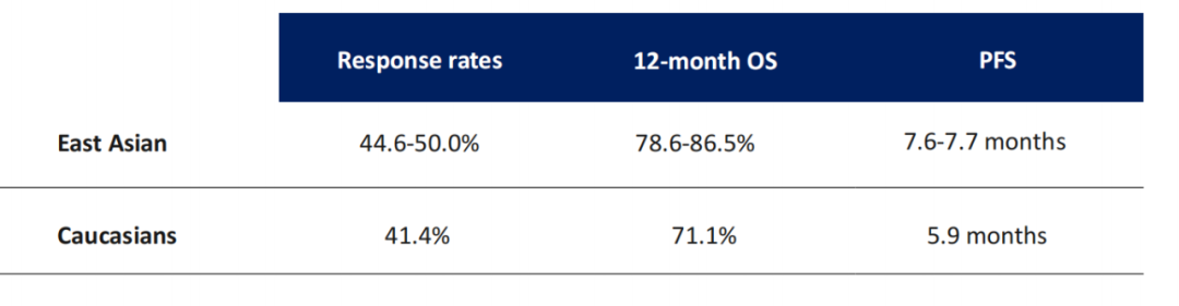 根据对东亚和全球使用紫杉醇和吉西他滨的研究进行的回顾性比较,亚洲人的化疗疗效一般与白种人相当。与全球人群相比,东亚人群的缓解率、12个月OS率和PFS率略高。