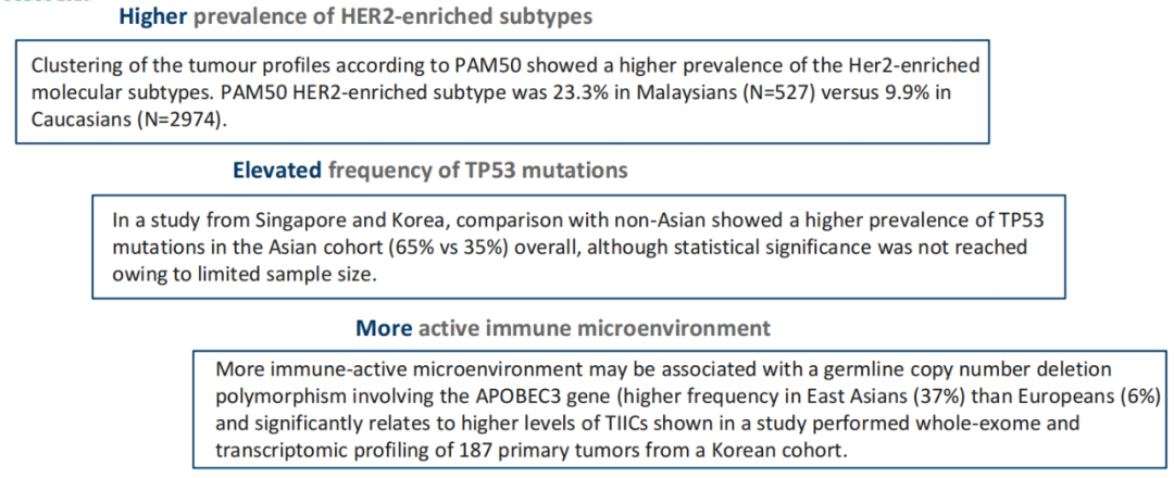 第二,亚洲乳腺癌的生物学行为与其他地区乳腺癌有些区别,特别是与西方国家相比差异较为显著。这些区别表现在TP53基因突变的频率、HER2的表达情况以及患者对治疗的反应和安全性等方面。