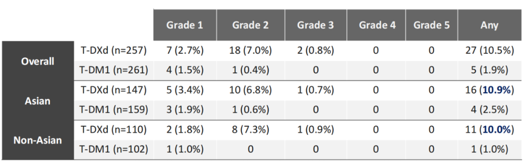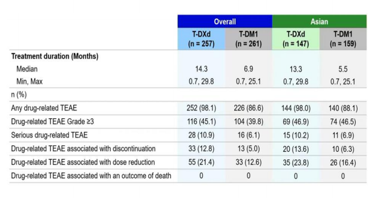 T-DXd对HER2+乳腺癌的亚洲人持续获益,DESTINY-Breast03研究中,309名参与者(59%)来自亚洲国家/地区(韩国、日本、中国大陆、台湾和香港)。在亚洲人群亚组中,与T-DM1相比,T-DXd显示出有临床意义的PFS获益和安全性,这与在总体人群中观察到的结果一致。亚洲人和非亚洲人的药物相关性间质性肺疾病发生率相当。