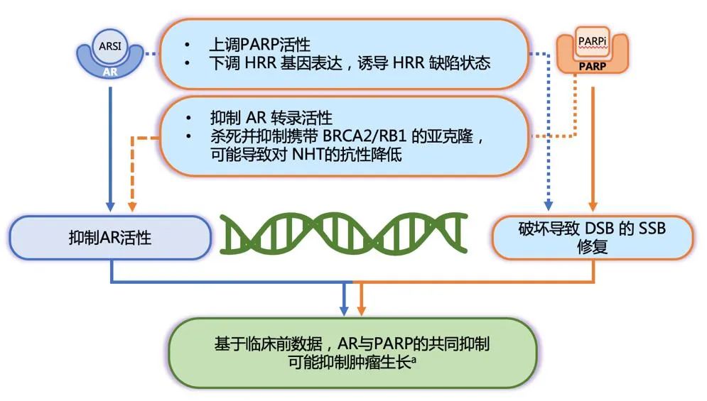 在PARP抑制剂的基础上联合NHT可以起到“1+1>2”的作用。首先,NHT对AR的阻断可导致HRR组分下调同时上调PARP酶的活性,在诱导HRR缺陷表型的同时增强DNA损伤检测和修复,从而提高PARP抑制剂的效果4-9。与此同时,PARP抑制剂也能够扩大NHT的获益——PARP酶是AR转录机制的关键组分,能够促进AR募集到细胞核、增强AR活性,因此抑制PARP酶会间接抑制AR功能8-10。