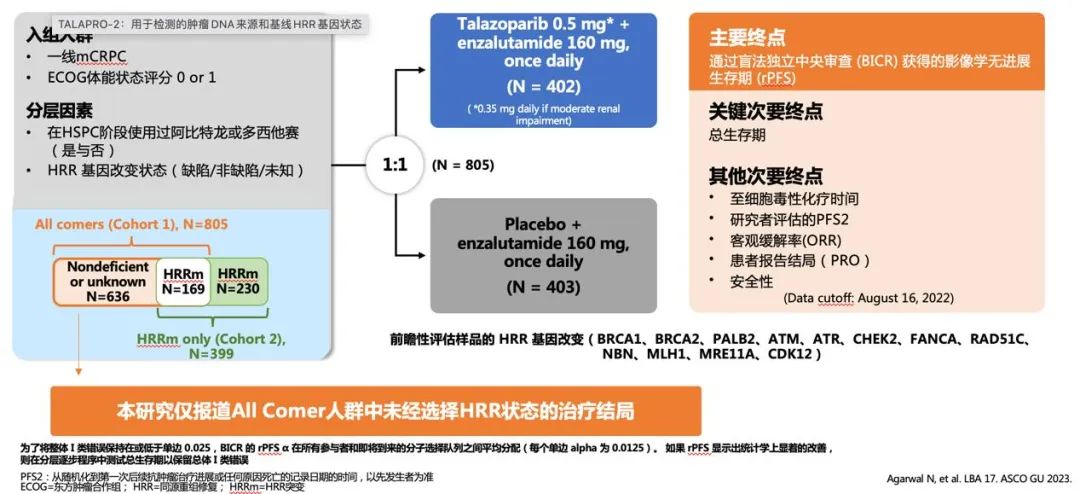 TALAPRO-2 III期同时关注全人群和HRRm人群,分别设置了两个研究队列,并采用双主要终点与关键次要终点顺序检验来对一类错误进行控制。队列1为全人群,纳入805例患者后(其中636名为HRR基因野生型或未知状态,169名确认为HRRm)改为仅纳入HRRm患者(补充纳入230名),直至与队列1中HRRm患者组成队列2达到399例1。