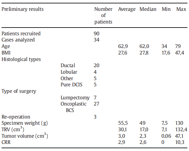 纳入患者纳入标准:原发,独立或多灶的,单侧cTis-T2,可进行BCS的患者;DCIS,IDC,ILC和其他类型(排除LCIS和ADH);年龄18-80岁,ASA 1-2,预期寿命超过三年;乳房X线检查结果显示厚度。
