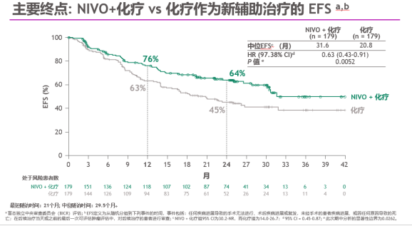 CheckMate-816研究的pCR结果显示,免疫联合组和化疗组的pCR分别为24.0%vs 2.2%(OR=13.94,P<0.0001),免疫联合组较化疗组pCR提升近11倍[4,5]。而日前发布的中位随访29.5个月时的EFS详细数据也同样亮眼。