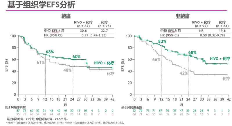 在鳞癌患者中,免疫联合组和化疗组的中位EFS分别为30.6和22.7个月(HR=0.77,95%CI:0.49-1.22);非鳞癌患者的数据分别为NR和19.6个月(HR=0.50,95%CI:0.32-0.79)。