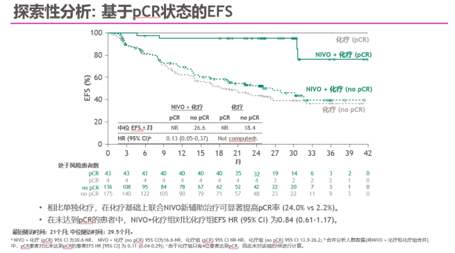 探索性分析结果发现,接受免疫新辅助治疗后达到pCR的患者相比没有达到的患者EFS显著延长,提示pCR可能是该免疫新辅助方案的一个长期疗效预测指标。