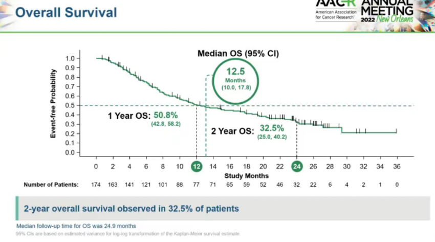 中位OS为12.5个月(95%CI:10.0-17.8);1年OS率为50.8%(95%CI:42.8%-58.2%),2年OS率为32.5%(95%CI:25.0%~40.2%)。