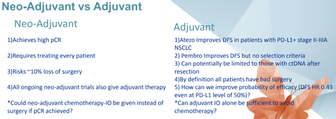 可能的过度治疗:选择真正获益人群的机会较少(需要ctDNA、驱动突变分析等)。Dr.Wakelee强调了检测驱动基因突变的重要性,而不是让患者匆忙接受新辅助治疗,从而避免让可能不会获益的患者接受这种治疗。