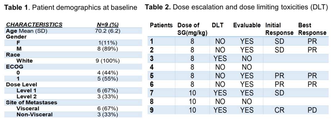 该研究共纳入了9例患者(8例男性,1例女性),均已完成Ⅰ期剂量递增研究。6例患者接受SG 8mg/kg治疗的患者中有1例发生DLT,3例患者接受10mg/kg治疗的患者中有2例发生DLT。DLT包括3级皮疹(n=2)和3级肺炎(n=1)。在联合I3+N1的情况下,SG的RP2D为8 mg/kg。