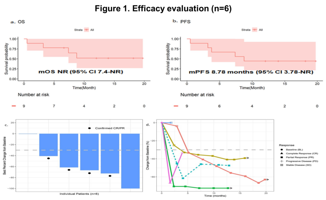 在9例患者中,有6例(4例SG剂量为8mg/kg,2例SG剂量为10mg/kg)可评估缓解情况,其中4例达到缓解(1例完全缓解,3例部分缓解),ORR为66.6%。中位DOR为9.2个月(范围4.6~12.0);mPFS为8.78个月(95%CI:3.78~NR),mOS未达到。